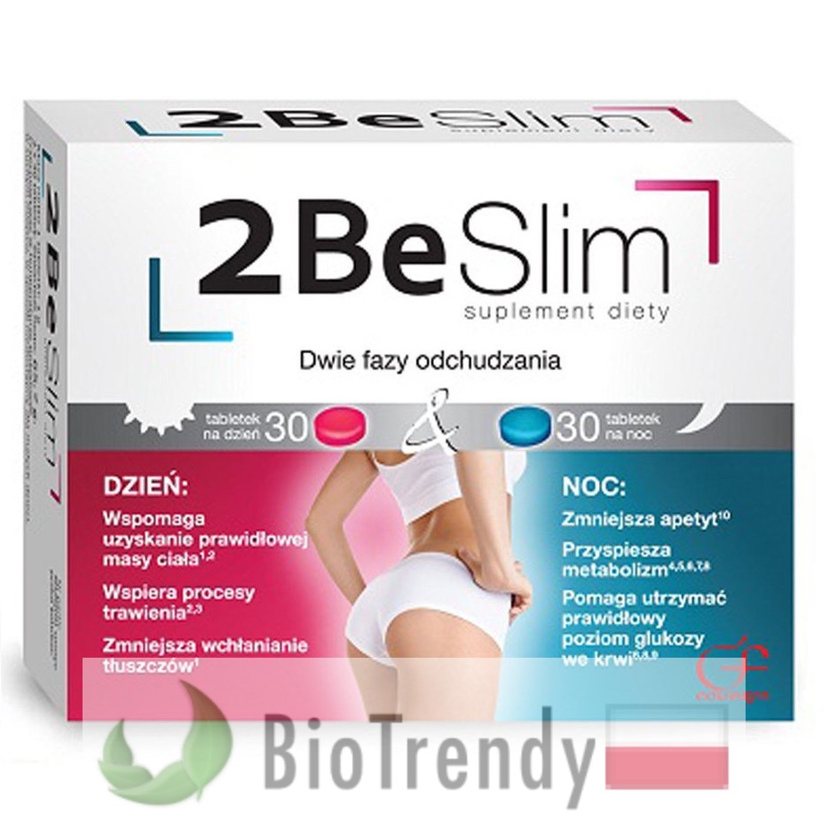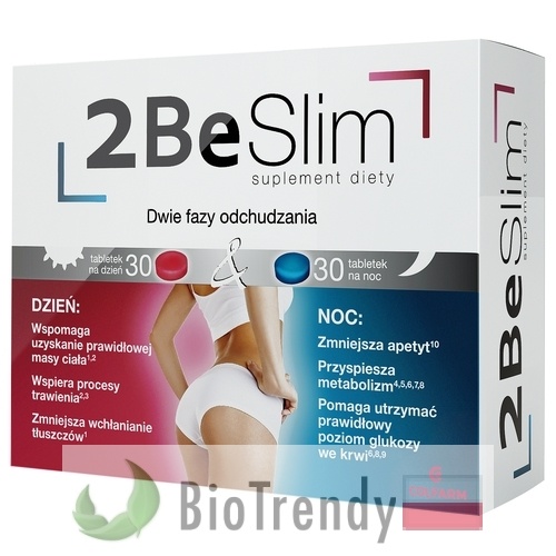 2Be Slim to produkt wspomagający proces odchudzania. Odpowiednio dobrane składniki produktu działają dwufazowo: w dzień i nocą. W fazie pierwszej usprawniają proces trawienny oraz zmniejszają wchłanianie tłuszczów, przez co wspomagają uzyskanie prawidłowej masy ciała. W fazie drugiej następuje zmniejszenie apetytu i jednocześnie przyspieszene procesu metabolizmu. Reguluje się poziom glukozy we krwi. Bogactwo składników preparatu 2Be Slim wspoamaga nie tylko proces odchudzania, ale również reguluje poziom glukozy i cholesterolu we krwi. Dzięki zawartości guarany, zielonej herbaty oraz imbiru, 2Be Slim zapewnia dobrą kondycję fizyczną i psychiczną, zmniejsza uczucie głodu i zmęczenia, a przy tym wspomaga również procesy trawienne i metabolizm lipidów oraz węglowodanów. Wyciąg z morszczynu, karczocha oraz cynamonu zapewnia prawidłowe funkcjonowanie układu trawiennego, poprawiając komfort trawienny i metabolizm energii. Preparat działa również energetyzująco i witalizująco, posiada właściwości antyoksydacyjne. Ponadto przyczynia się do regulacji aktywności hormonalnej.