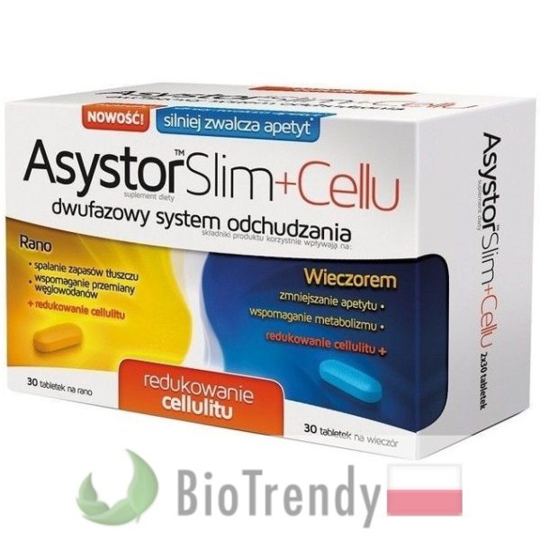 Asystor Slim + Cellu to suplement diety w postaci kapsułek, który oparty jest wyłącznie o naturalne składniki odżywcze, takie jak: Winorośl właściwa (Winorośl winna: Vitis vinifera), Workoliść członowaty (Alga brunatna: Ascophyllum nodosum), Pomarańcza gorzka (Pomarańcza kwaśna: Citrus Aurantium), Zielona herbata (Herbata chińska: Camellia sinensis), Ostrokrzew paragwajski (Yerba Mate: Ilex paraguariensis), Tamaryndowiec malabarski (Garcinia cambogia: Garcinia gummi-gutta), Opuncja figowa (Figa indyjska: Opuntia ficus-indica), Spirulina (Arthrospira platensis), Ocet jabłkowy (ACV: Apple cider vinegar) oraz 4 innych składników wspomagających.