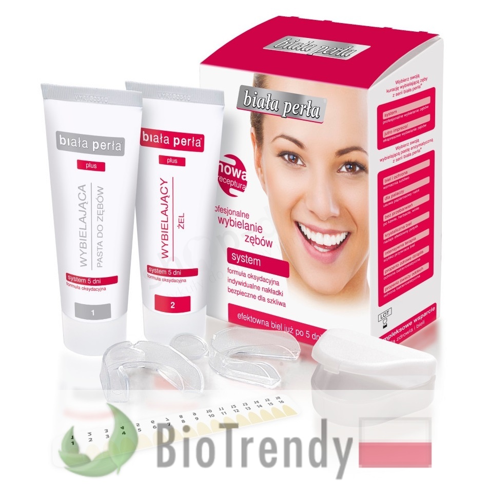 Przed przystąpieniem do zabiegu wybielania należy dokładnie umyć zęby używając dołączonej do zestawu pasty wybielającej Biała Perła, po czym przepłukać jamę ustną letnią wodą. Następnie należy wyprofilować ustnik poprzez zanurzenie go na 2-4 sekundy w wodzie o temperaturze 80-85°C. Po czym włożyć ustnik do jamy ustnej, dokładnie przycisnąć do zębów i uformować. W razie niepowodzenia całą czynność można powtórzyć raz jeszcze. Kolejno należy nanieść odpowiednią ilość żelu wybielającego za pomocą aplikatora na wewnętrzną ściankę górnej oraz dolnej części ustnika. Podczas stosowania żelu wybielajacego zaleca się zminimalizować jego kontakt z wargami oraz dziąsłami. Umieszczamy ustnik na obu łukach zębowych, usuwając dodatkowo za pomocą chusteczki higienicznej nadmierną ilość żelu wybielajacego – wrażenie nadmiaru śliny w czasie pierwszych minut zabiegu jest normalne. Żel wybielający należy pozostawić na zębach przez 20 minut. Czynność można przedłużać maksymalnie do 30 minut. Po zakończeniu zabiegu dokładnie przepłukać jamę ustną letnią wodą oraz dokładnie umyć ustnik. W celu uzyskania optymalnych efektów wybielających zaleca się stosować Biała Perła System 5 Dni 1-2 razy dziennie przez 5-14 dni. Po osiągnięciu zamierzonego efektu można powtarzać zabieg raz w miesiącu.