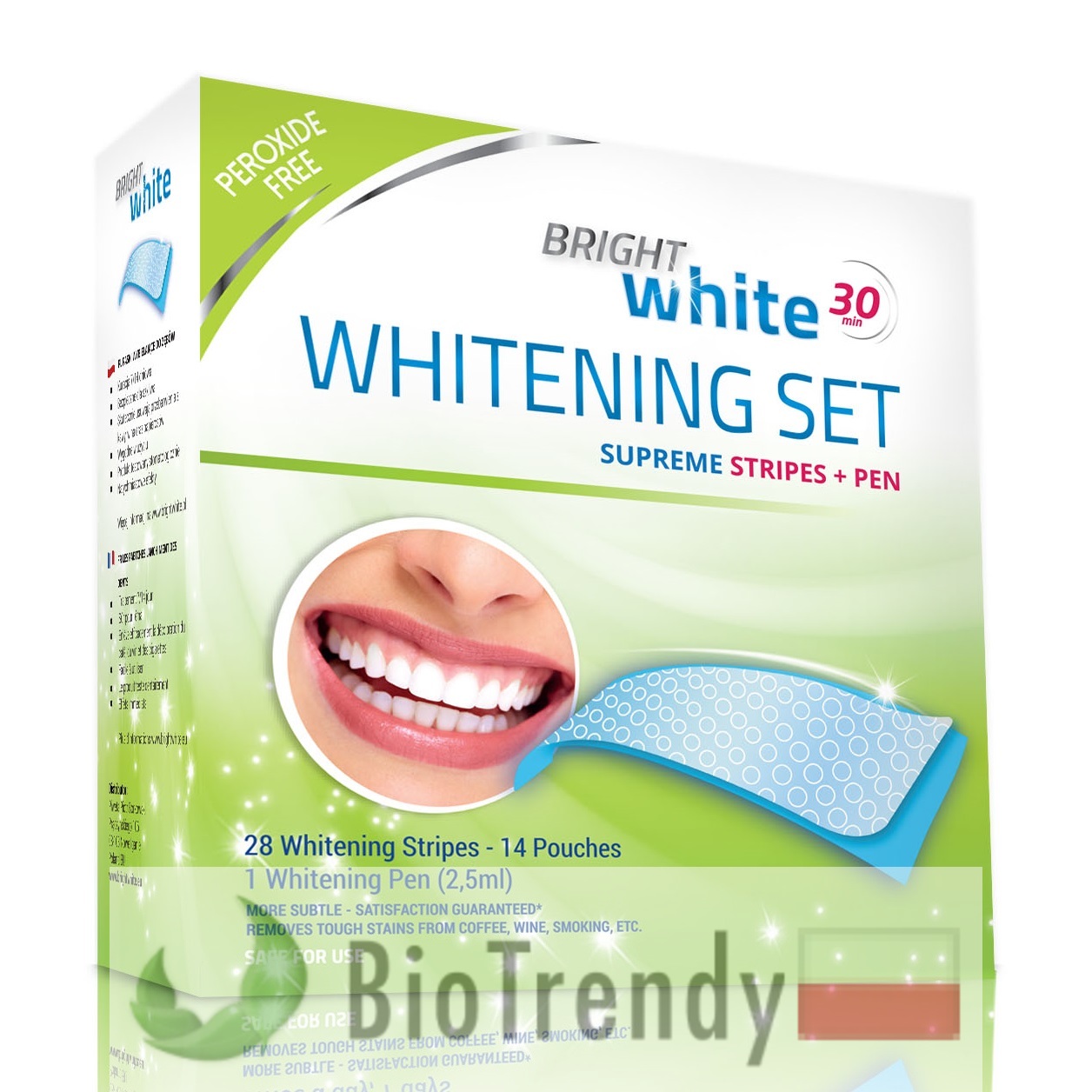 Bright White Whitening Set Supreme Peroxide Free Stripes + Pen to profesionalny zestaw do wybielania zbębów przeznaczony dla osób, które chcą szybko i efektywnie uzyskać śnieżnobiały uśmiech bez wychodzenia z domu.