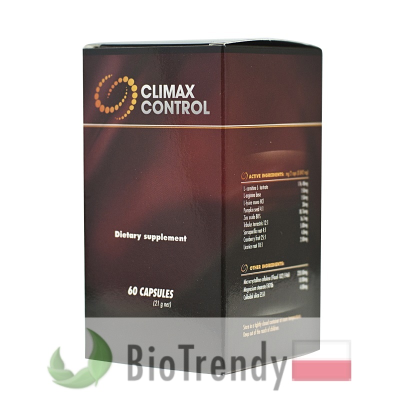 Climax Control to suplement diety w postaci kapsułek, który oparty jest wyłącznie o naturalne składniki odżywcze, takie jak: Dynia zwyczajna (Cucurbita pepo), Buzdyganek naziemny (Tribulus terrestris), Sarsaparilla (Kolcorośl lekarska: Smilax ornata), Żurawina amerykańska (Vaccinium macrocarpon), Lukrecja gładka (Glycyrrhiza glabra), L-arginina (Arg: Kwas 2-amino-5-guanidynopentanowy), L-karnityna (3-hydroksy-4-(trimetyloamonio)butanian) oraz L-lizyna (Lys: Kwas 2,6-diaminoheksanowy).