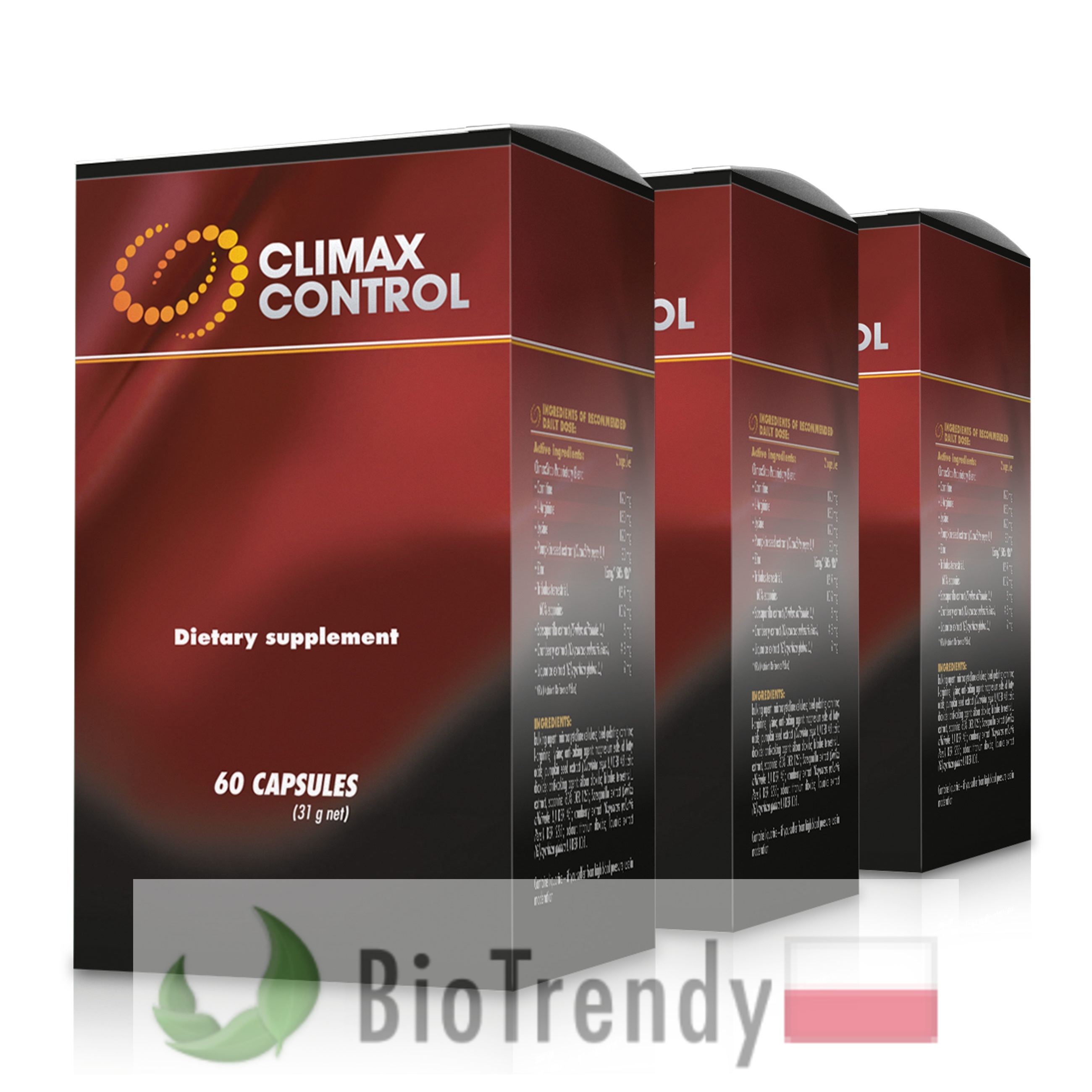 Dokładnie sprawdzona receptura Climax Control gwarantuje niezachwianą, dobrą kondycję seksualną. Climax Control sprawi, że Twoje życie w łóżku wejdzie na wyższy poziom, podarowując Ci lepsze samopoczucie, świetne relacje z Twoją partnerką i spotęgowanie doznań. Nasz preparat jest w pełni bezpiecznym i całkowicie naturalnym produktem. Jest suplementem diety, dlatego nie działa tak ryzykownie, jak lekarstwo. Pozwoli Ci uporać się z problemem przedwczesnego wytrysku i innymi nieproszonymi sytuacjami ze wzwodem, przyczyniając się do ogólnego polepszenia Twojej seksualnej rzeczywistości.