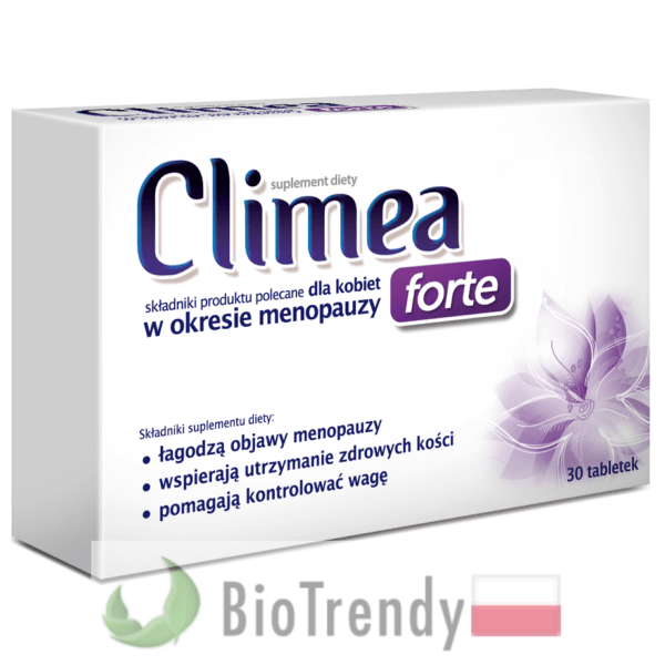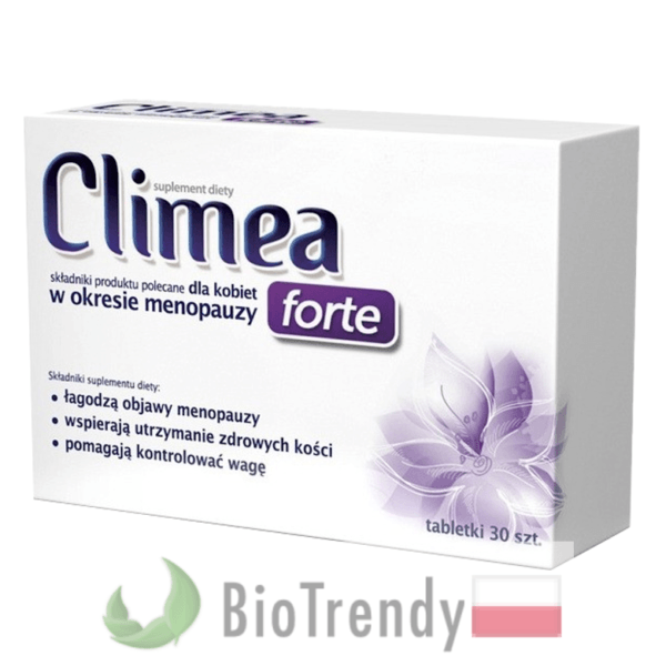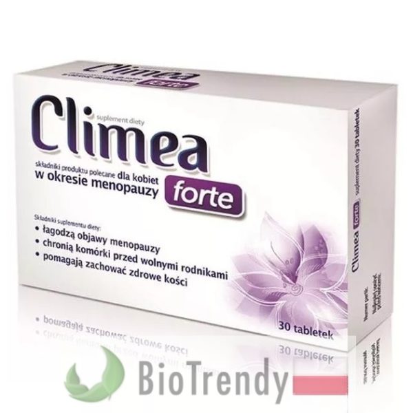 Climea Forte to suplement diety w postaci tabletek, który oparty jest wyłącznie o naturalne składniki odżywcze, takie jak: Izoflawony sojowe (Soy Isoflavones: Genisteina, Daidzeina), Chmiel zwyczajny (Humulus lupulus), Len zwyczajny (Słowień: Linum usitatissimum), Witamina B6 (PN: Pirydoksyna), Witamina B9 (Kwas foliowy: Acidum folicum), Witamina D3 (Cholekalcyferol: Cholecalciferolum), Witamina E (α-Tokoferole) oraz Wapń (Ca: Calcium).