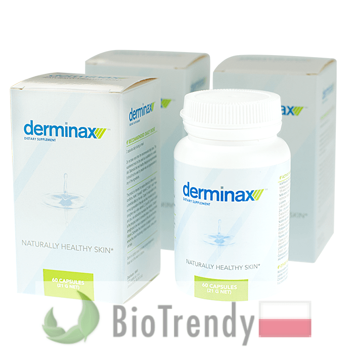 Derminax to suplement diety w postaci kapsułek, który oparty jest wyłącznie o naturalne składniki odżywcze, takie jak: Skrzyp polny (Equisetum arvense), Pokrzywa zwyczajna (Urtica dioica), Hydrolizat kolagenu (Żelatyna: Hydrolyzed collage), L-cystyna (Kwas 3,3′-disulfanodiylobis(R)-2-aminopropanowy), Witamina B1 (Tiamina: Aneuryna), Witamina B2 (Ryboflawina: Riboflavinum), Witamina B3 (PP: Niacyna, Kwas nikotynowy), Witamina B5 (Kwas pantotenowy), Witamina B6 (PN: Pirydoksyna), Witamina B7 (Witamina H: Biotyna), Witamina B9 (Kwas foliowy: Acidum folicum), Witamina B12 (Kobalamina) oraz 4 innych składników wspomagających.