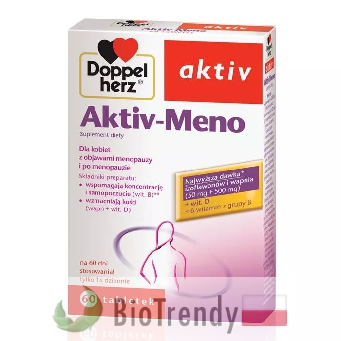 Doppelherz aktiv Aktiv-Meno to suplement diety w postaci tabletek, który oparty jest wyłącznie o naturalne składniki odżywcze, takie jak: Izoflawony sojowe (Soy Isoflavones: Genisteina, Daidzeina), Witamina B1 (Tiamina: Aneuryna), Witamina B2 (Ryboflawina: Riboflavinum), Witamina B6 (PN: Pirydoksyna), Witamina B7 (Witamina H: Biotyna), Witamina B9 (Kwas foliowy: Acidum folicum), Witamina B12 (Kobalamina), Witamina D3 (Cholekalcyferol: Cholecalciferolum) oraz Wapń (Ca: Calcium).