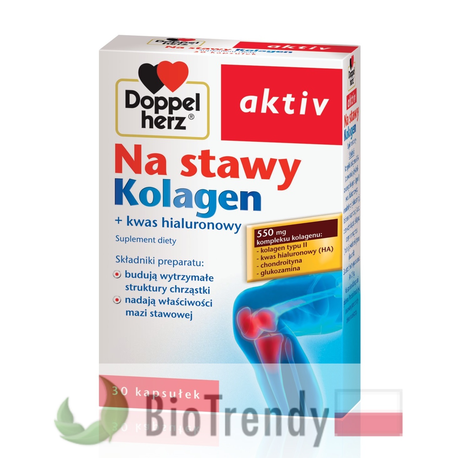 Doppelherz aktiv Na stawy Kolagen to suplement diety w postaci kapsułek, który oparty jest wyłącznie o naturalne składniki odżywcze, takie jak: Natywny kolagen typu II (COL2A1: Collagen type II alpha 1), Siarczan chondroityny (GAG: Siarczanowy glikozaminoglikan), Glukozamina (Glucosaminum: α-D-glukozamina) oraz Kwas hialuronowy (HA: Acidum hyaluronicum).