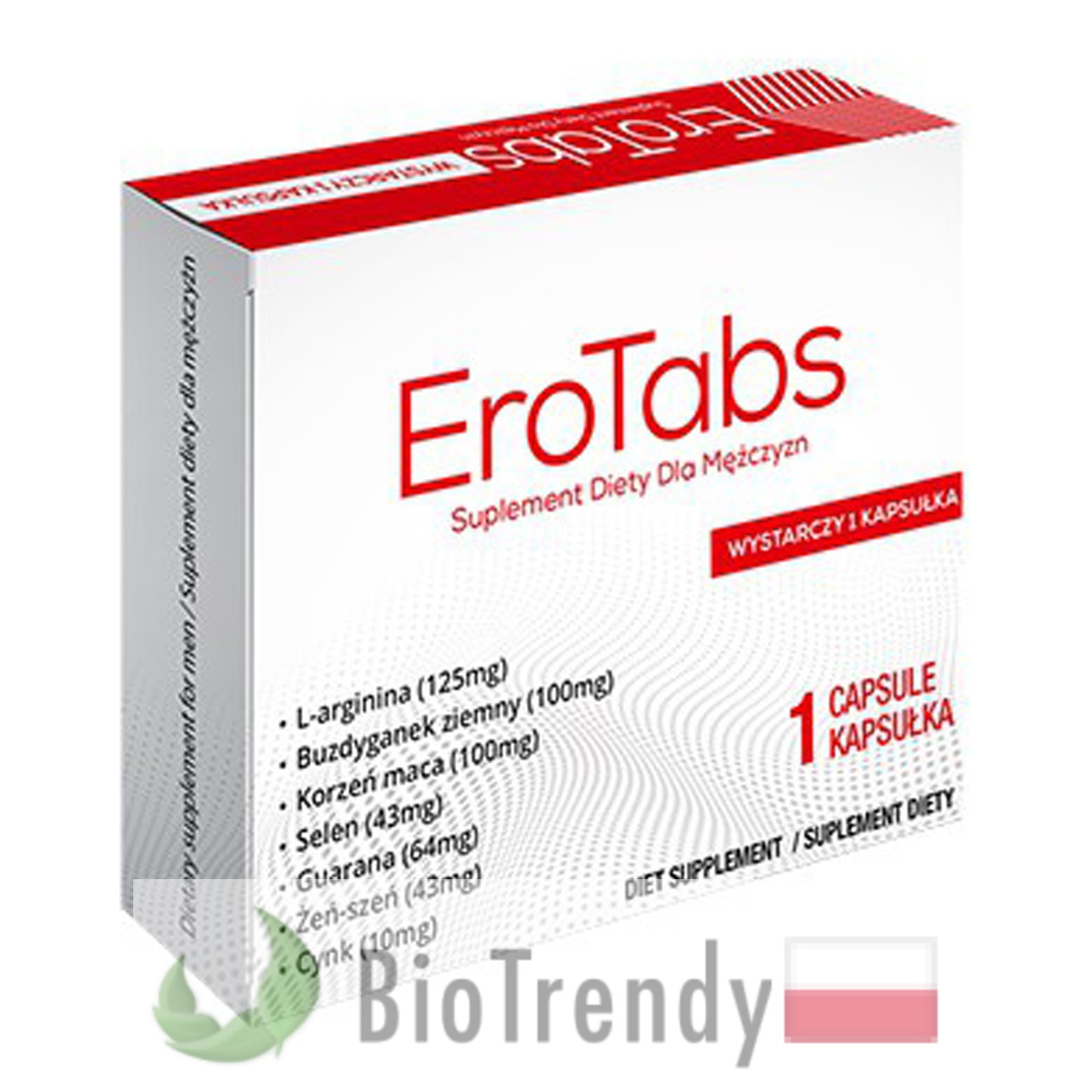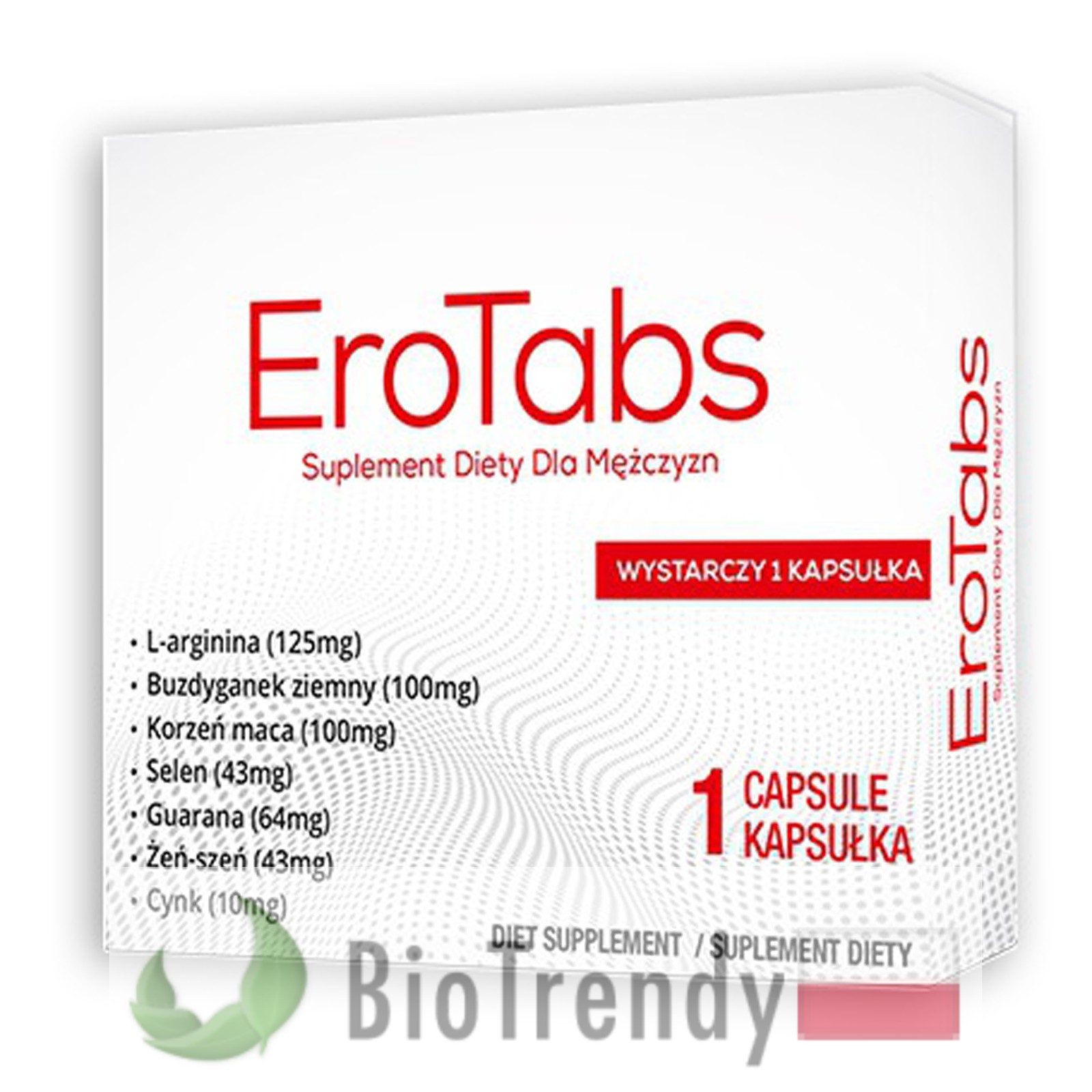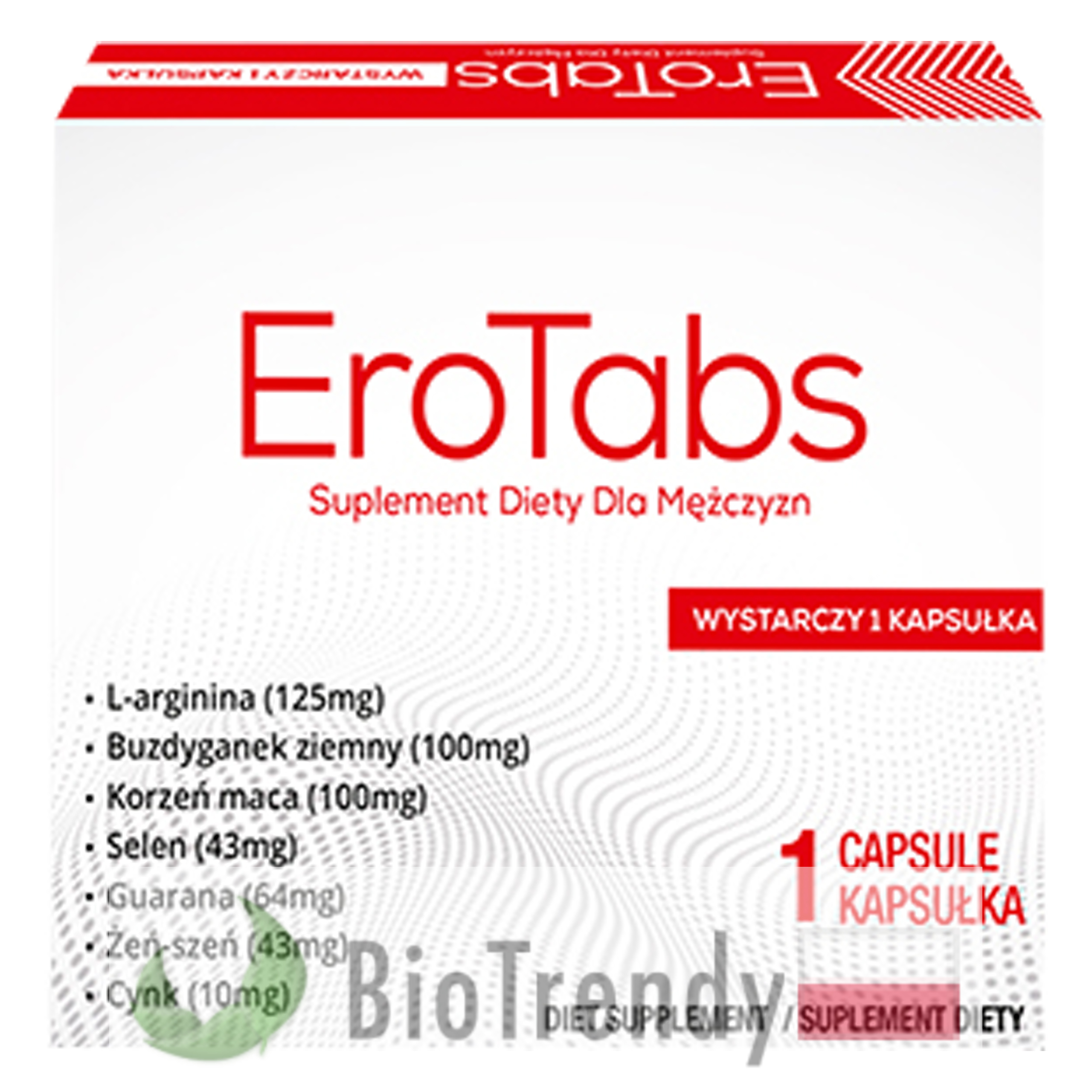 EroTabs to suplement diety w postaci kapsułek, który oparty jest wyłącznie o naturalne składniki odżywcze, takie jak: L-arginina (Arg: Kwas 2-amino-5-guanidynopentanowy), Buzdyganek naziemny (Tribulus terrestris), Pieprzyca peruwiańska (Maca: Lepidium meyenii), Paulinia guarana (Guarana: Paullinia cupana), Żeń-szeń właściwy (Żeń-szeń chiński: Panax ginseng), Cynk (Zn: Zincum) oraz Selen (Se: Selenium).