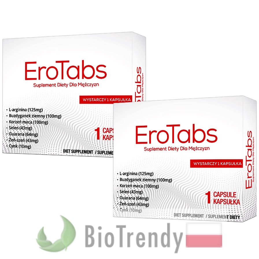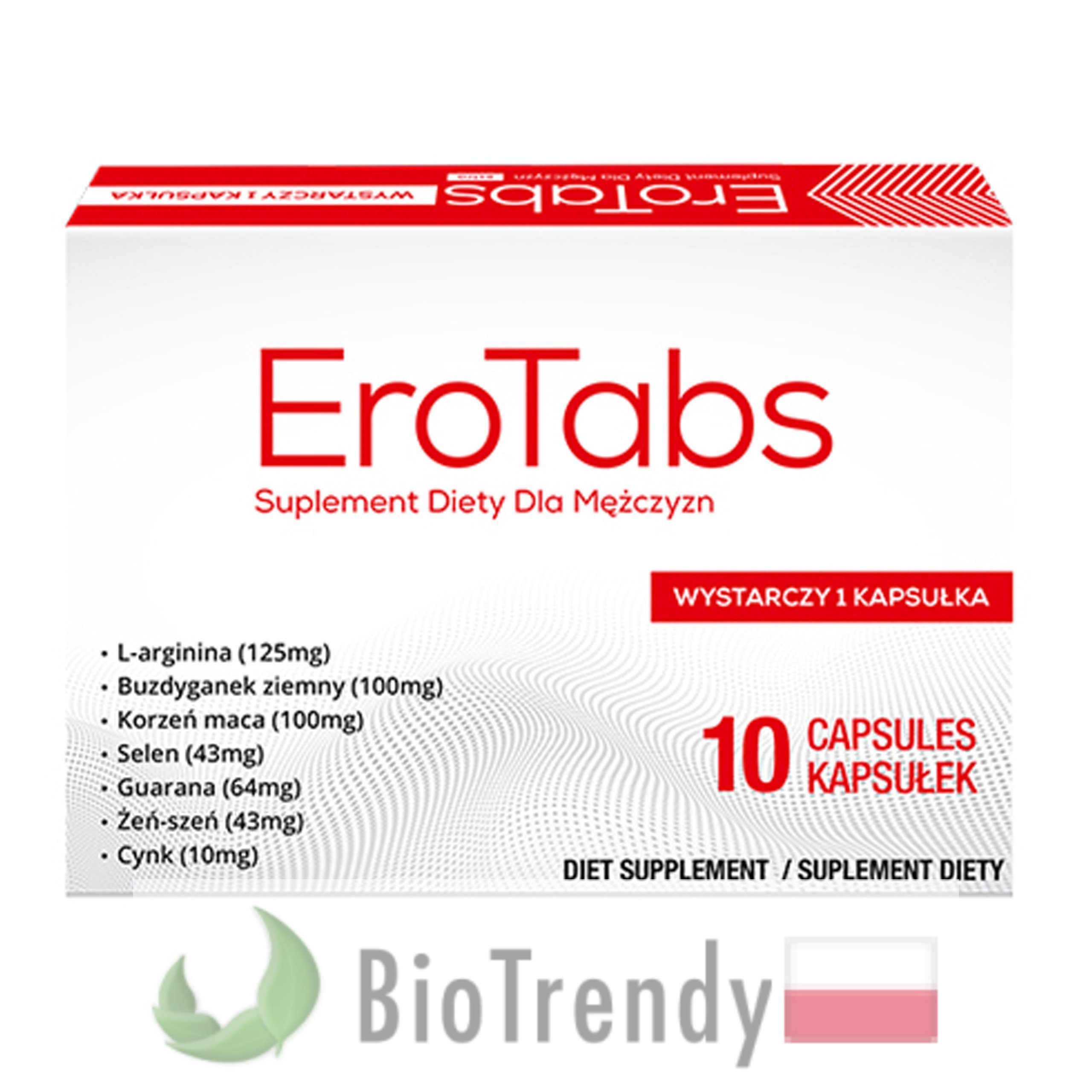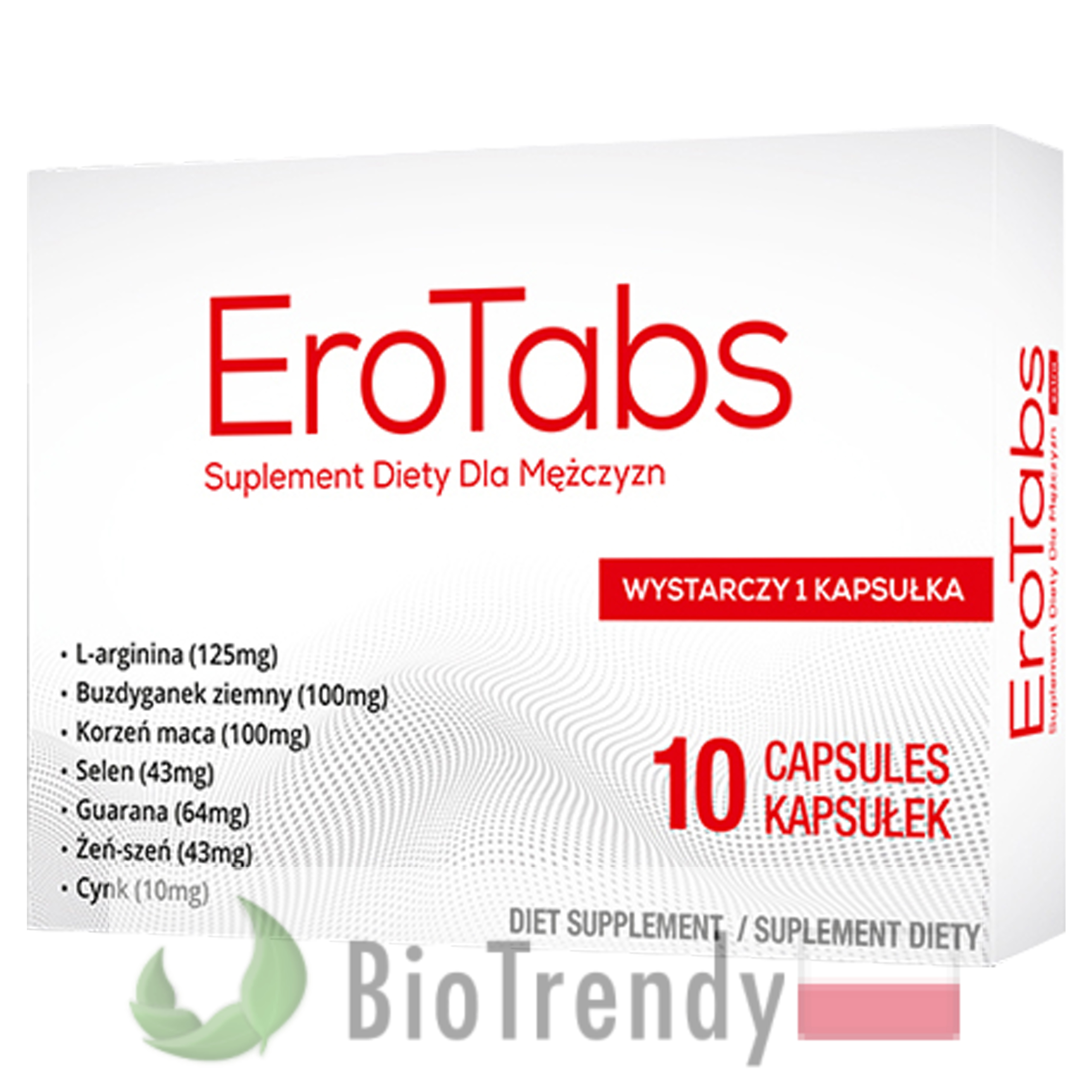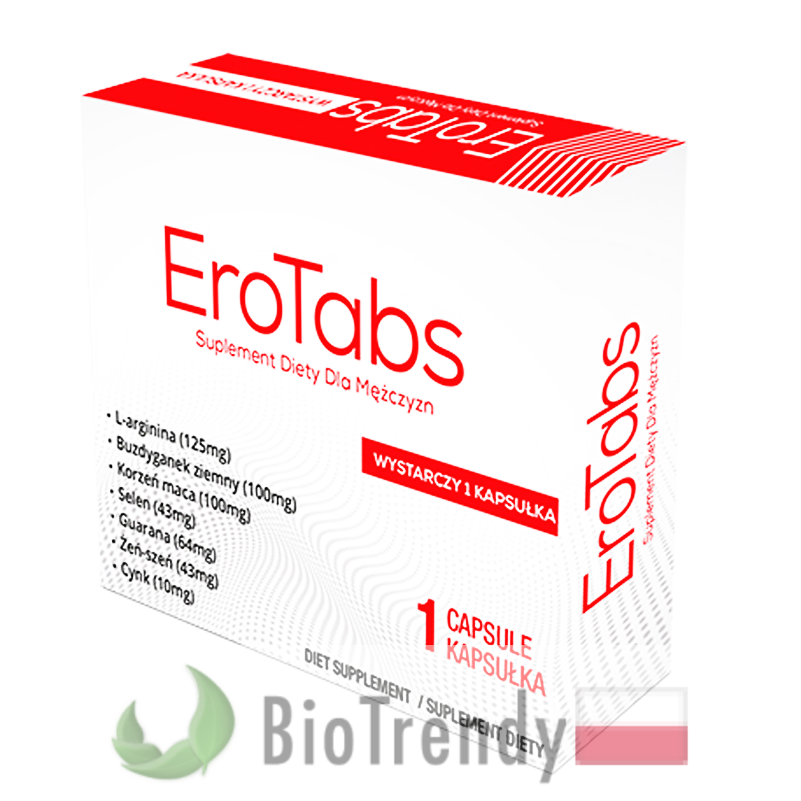 EroTabs to suplement diety w postaci kapsułek, który oparty jest wyłącznie o naturalne składniki odżywcze, takie jak: L-arginina (Arg: Kwas 2-amino-5-guanidynopentanowy), Buzdyganek naziemny (Tribulus terrestris), Pieprzyca peruwiańska (Maca: Lepidium meyenii), Paulinia guarana (Guarana: Paullinia cupana), Żeń-szeń właściwy (Żeń-szeń chiński: Panax ginseng), Cynk (Zn: Zincum) oraz Selen (Se: Selenium).