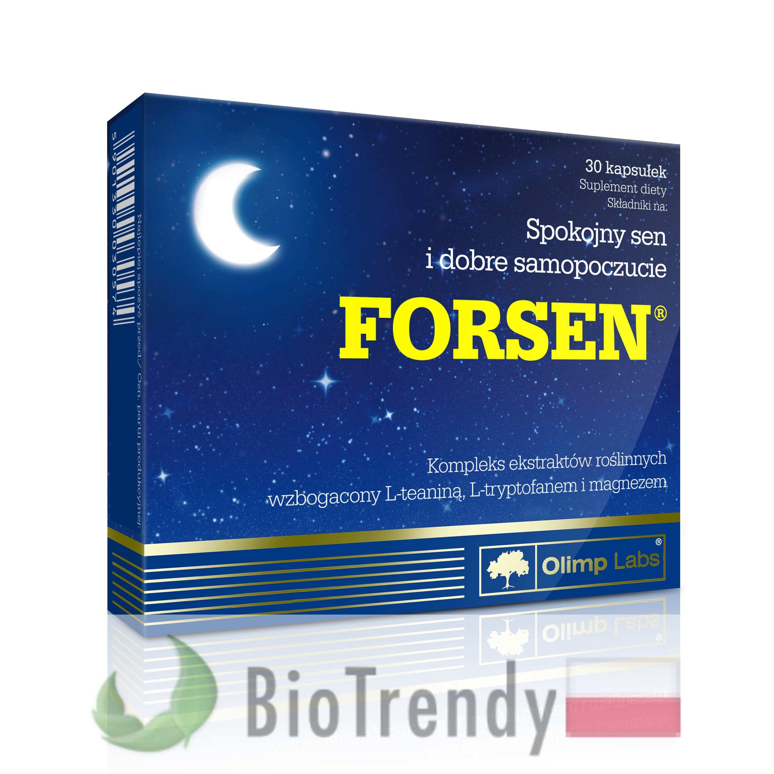 Forsen to suplement diety w postaci kapsułek, który oparty jest wyłącznie o naturalne składniki odżywcze, takie jak: Owies zwyczajny (Avena sativa), Melisa lekarska (Cytrynowe ziele: Melissa officinalis), Chmiel zwyczajny (Humulus lupulus), Szafran uprawny (Krokus uprawny: Crocus sativus), L-teanina (Kwas 2-amino-5-(etyloamino)-5-oksopentanowy), L-tryptofan (Trp: kwas (2S)-2-amino-3-(1H-indol-3-ylo)propanowy), Kwas gamma-aminomasłowy (GABA: kwas γ-aminomasłowy), Witamina B3 (PP: Niacyna, Kwas nikotynowy), Witamina B6 (PN: Pirydoksyna) oraz Magnez (Mg: Magnesium).