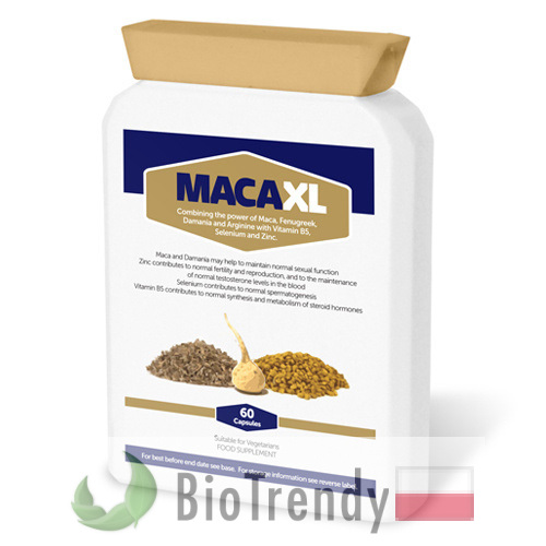 Maca XL to suplement diety w postaci kapsułek, który oparty jest wyłącznie o naturalne składniki odżywcze, takie jak: Pieprzyca peruwiańska (Maca: Lepidium meyenii), Kozieradka pospolita (Kozieradka lekarska: Trigonella foenum-graecum), Damiana (Turnera diffusa), L-arginina (Arg: Kwas 2-amino-5-guanidynopentanowy), Witamina B5 (Kwas pantotenowy), Cynk (Zn: Zincum) oraz Selen (Se: Selenium).
