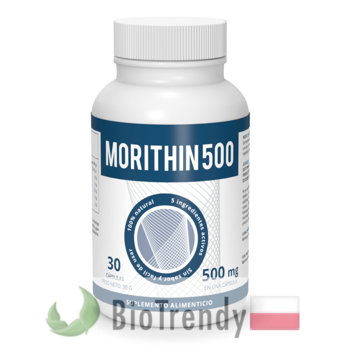 Morithin 500 to suplement diety w postaci kapsułek, który oparty jest wyłącznie o naturalne składniki odżywcze, takie jak: Moringa olejodajna (Drzewo chrzanowe: Moringa oleifera), Keton malinowy (4-(4-hydroksyfenylo)-butan-2-on), L-karnityna (3-hydroksy-4-(trimetyloamonio)butanian), Witamina B4 (Cholina: Kation 2-hydroksyetylo(trimetylo)amoniowy) oraz Witamina B8 (Inozytol: Cykloheksanoheksaol).