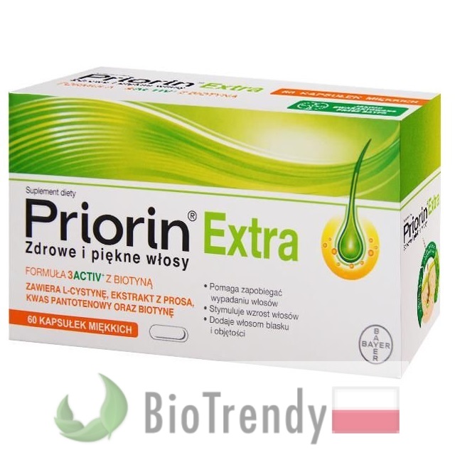 Priorin Extra to suplement diety w postaci kapsułek, który oparty jest wyłącznie o naturalne składniki odżywcze, takie jak: Proso zwyczajne (Proso właściwe: Panicum miliaceum), L-cysteina (Cys: Kwas (2R)-2-amino-3-sulfanylopropanowy), Witamina B5 (Kwas pantotenowy) oraz Witamina B7 (Witamina H: Biotyna).