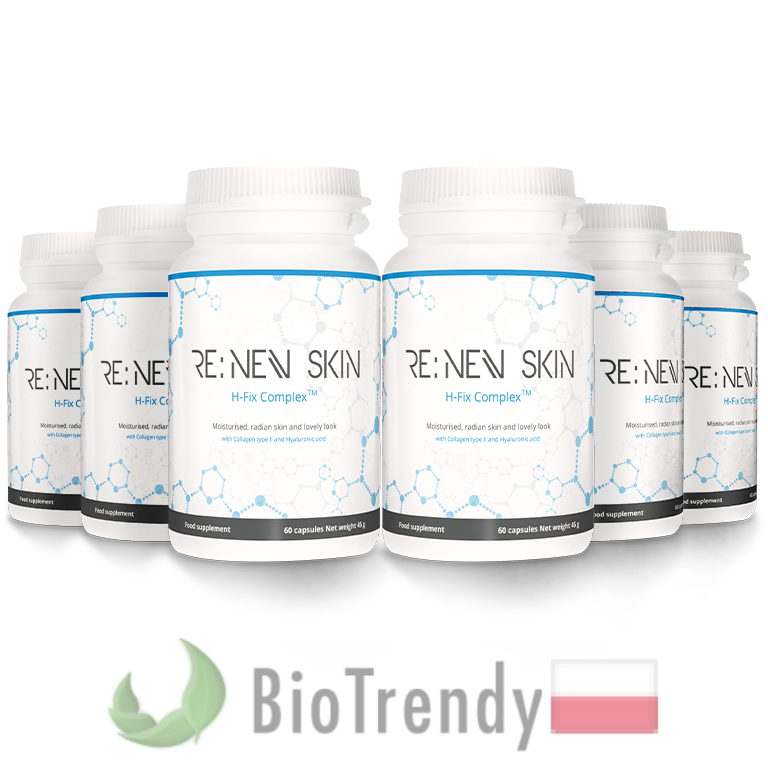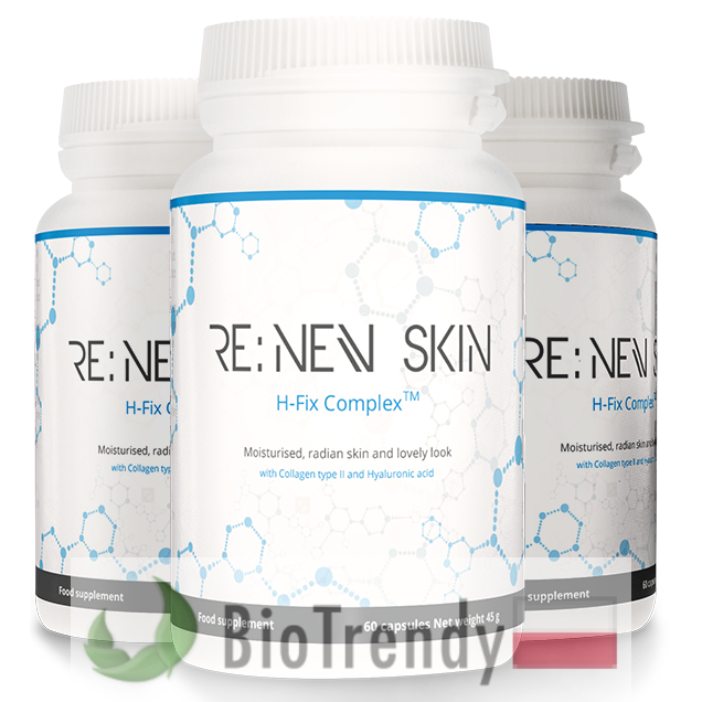 Re:Nev Skin to suplement diety w postaci kapsułek, który oparty jest wyłącznie o naturalne składniki odżywcze, takie jak: Natywny kolagen typu II (COL2A1: Collagen type II alpha 1), Kwas hialuronowy (HA: Acidum hyaluronicum), Witamina B7 (Witamina H: Biotyna), Witamina C (E300: Kwas askorbinowy) oraz Cynk (Zn: Zincum).
