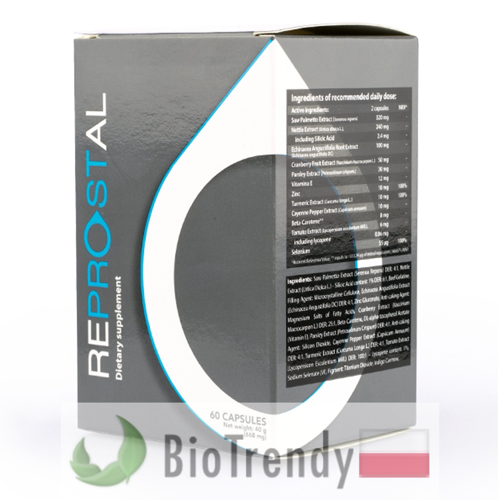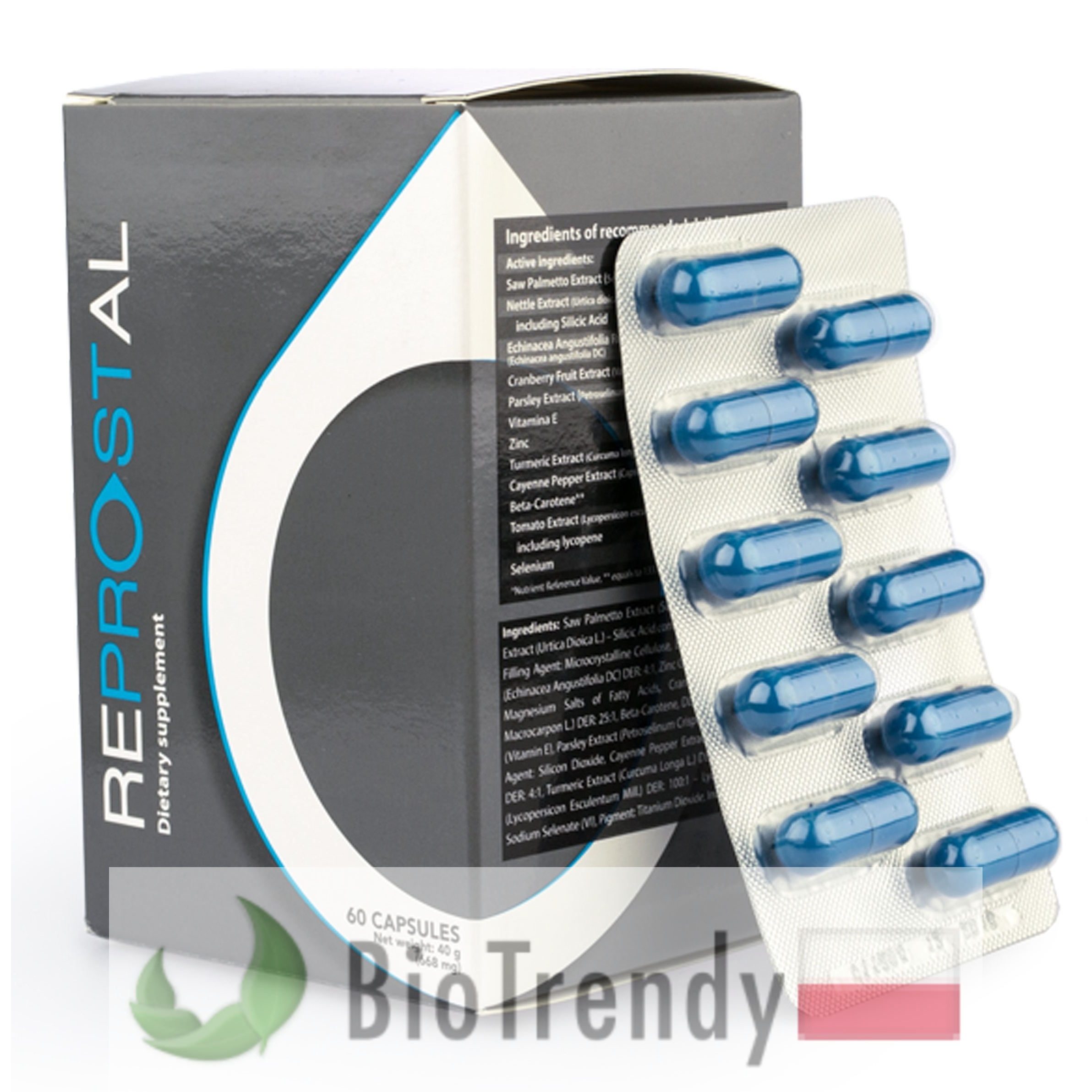 Reprostal to suplement diety w postaci kapsułek, który oparty jest wyłącznie o naturalne składniki odżywcze, takie jak: Pomidor zwyczajny (Psianka: Solanum lycopersicum), Palma sabalowa (Bocznia piłkowana: Serenoa repens), Jeżówka wąskolistna (Echinacea angustifolia), Pokrzywa zwyczajna (Urtica dioica), Żurawina amerykańska (Vaccinium macrocarpon), Pietruszka zwyczajna (Petroselinum crispum), Papryka Cayenne (Capsicum frutescens), Ostryż długi (Kurkuma: Curcuma longa), Beta-karoten (Prowitamina A: β-karoten), Witamina E (α-Tokoferole), Cynk (Zn: Zincum) oraz Selen (Se: Selenium).