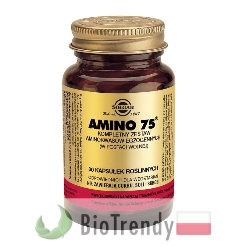 Solgar Amino 75 to suplement diety w postaci kapsułek, który oparty jest wyłącznie o naturalne składniki odżywcze, takie jak: L-histydyna (His: Kwas 2-amino-3-(imidazolo-4-ilo)propanowy), L-izoleucyna (Isoleucinum: Kwas (2S,3S)-2-amino-3-metylopentanowy), L-leucyna (Leu: Kwas (S)-2-amino-4-metylopentanowy), L-lizyna (Lys: Kwas 2,6-diaminoheksanowy), L-metionina (Met: Kwas 2-amino-4-(metylotio)butanowy), L-fenyloalanina (Phe: Kwas 2-amino-3-fenylopropanowy), L-treonina (Thr: kwas (2S,3R)-2-amino-3-hydroksybutanowy) oraz L-walina (Wal: Kwas (S)-2-amino-3-metylobutanowy).