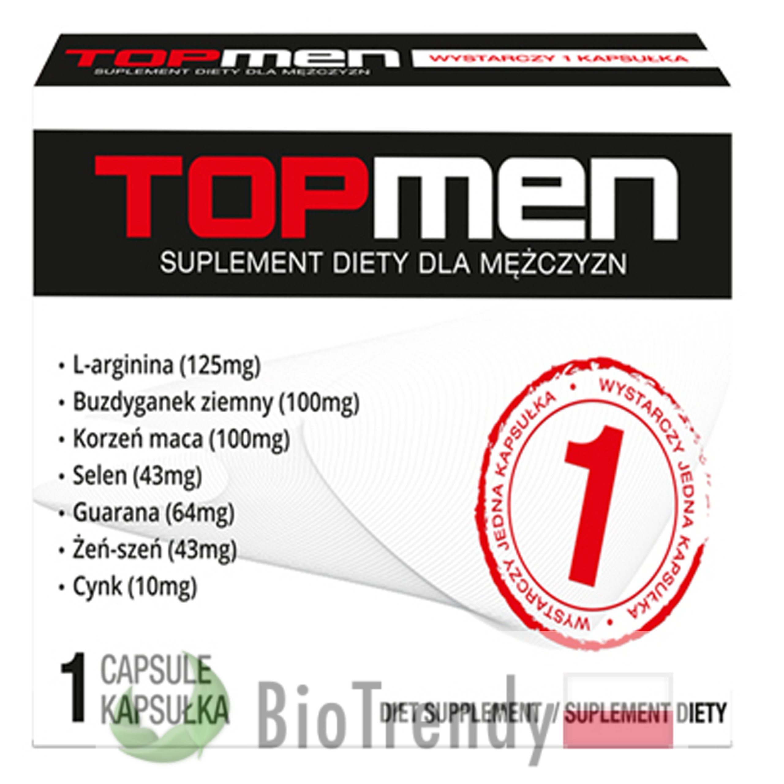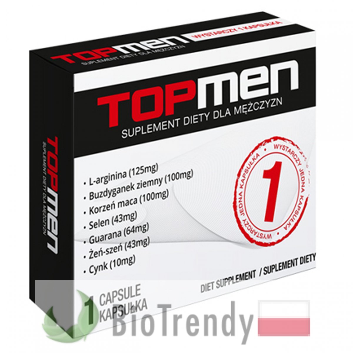 Top Men należy do jednych z bardziej skuteczniejszych suplementów diety stymulujących erekcję. Jak to jest w ogóle możliwe? Wystarczy spożycie jedynie jednej kapsułki na ok. trzydzieści do sześćdziesięciu minut przed planowanym zbliżeniem, aby móc cieszyć się nim dłużej i odczuwać z niego pełną satysfakcje. A wszystko dzięki zawartości odpowiednio dobranych składników, które zostały zamknięte w kapsułce w odpowiednich proporcjach, aby uzyskać jak najbardziej zadowalające efekty stosowania! Top Men pomimo tego, że nie znajduję się na rynku tak długi czas uzyskał już duże uznanie wśród wielu zadowolonych klientów z całej europy.