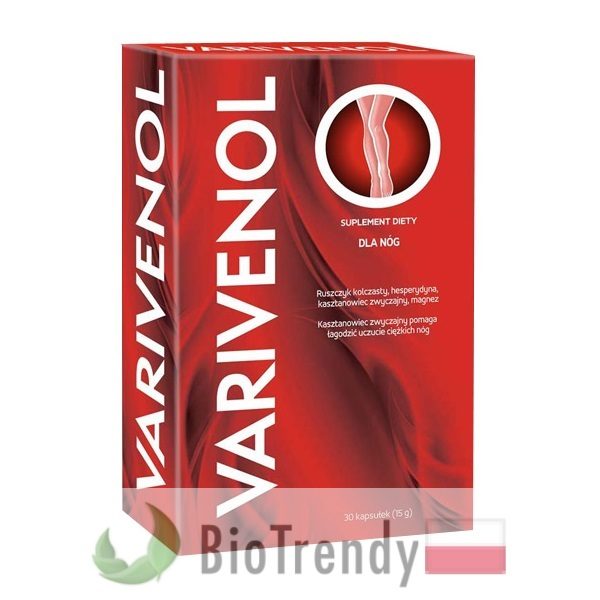 Varivenol to suplement diety w postaci kapsułek, który oparty jest wyłącznie o naturalne składniki odżywcze, takie jak: Kasztanowiec zwyczajny (Kasztanowiec biały: Aesculus hippocastanum), Myszopłoch kolczasty (Ruszczyk kolczasty: Ruscus aculeatus), Hesperydyna (7-O-rutynozyd hesperetyny) oraz Magnez (Mg: Magnesium).