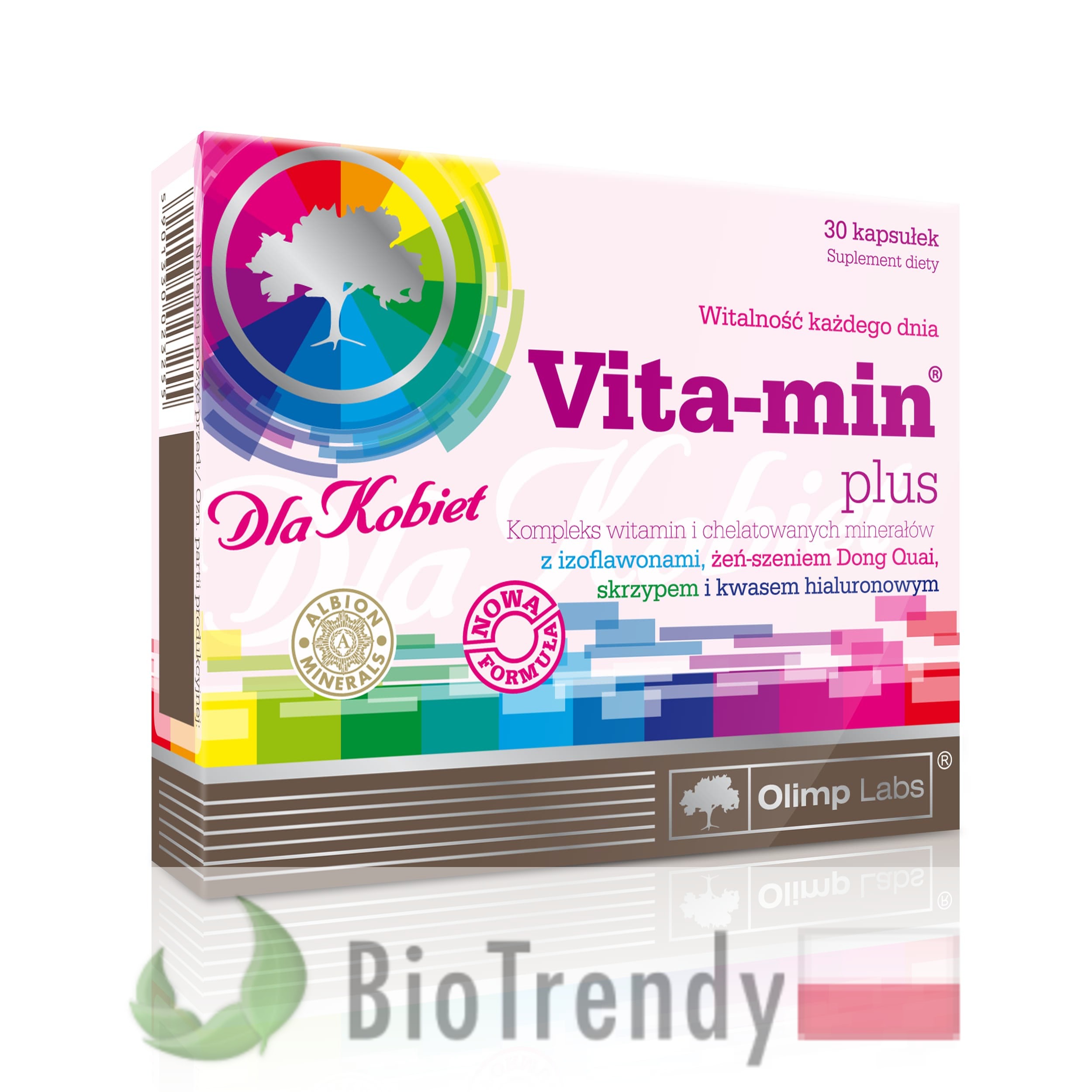 Vita-min plus Dla Kobiet to suplement diety w postaci kapsułek, który oparty jest wyłącznie o naturalne składniki odżywcze, takie jak: Dzięgiel chiński (Dong quai: Angelica sinensis), Skrzyp polny (Equisetum arvense), Pieprz czarny (Piper nigrum), Izoflawony sojowe (Soy Isoflavones: Genisteina, Daidzeina), Kwas hialuronowy (HA: Acidum hyaluronicum), Witamina A (Retinol: Akseroftol), Witamina B1 (Tiamina: Aneuryna), Witamina B2 (Ryboflawina: Riboflavinum), Witamina B3 (PP: Niacyna, Kwas nikotynowy), Witamina B5 (Kwas pantotenowy), Witamina B6 (PN: Pirydoksyna), Witamina B7 (Witamina H: Biotyna) oraz 15 innych składników wspomagających.