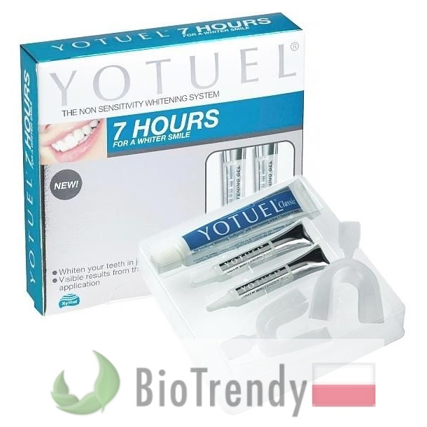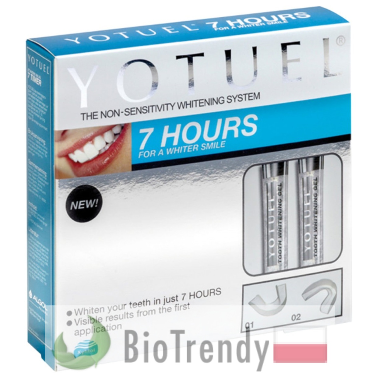 Przed przystąpieniem do zabiegu wybielania należy dokładnie umyć zęby, po czym przepłukać jamę ustną letnią wodą. Następnie należy wyprofilować ustnik poprzez zanurzenie go na 2-4 sekundy w wodzie o temperaturze 80-85°C. Po czym włożyć ustnik do jamy ustnej, dokładnie przycisnąć do zębów i uformować. W razie niepowodzenia całą czynność można powtórzyć raz jeszcze. Potem należy dokładnie umyć zęby przez ok. 3 minuty używając dołączonej do zestawu pasty wybielającej Yotuel Whitening, po czym przepłukać jamę ustną letnią wodą. Następnie należy nanieść odpowiednią ilość żelu wybielającego za pomocą aplikatora na wewnętrzną ściankę górnej oraz dolnej części ustnika. Podczas stosowania żelu wybielającego zaleca się zminimalizować jego kontakt z wargami oraz dziąsłami. Umieszczamy ustnik na obu łukach zębowych, usuwając dodatkowo za pomocą chusteczki higienicznej nadmierną ilość żelu wybielającego – wrażenie nadmiaru śliny w czasie pierwszych minut zabiegu jest normalne. Żel wybielający należy pozostawić na zębach przez 45 minut. Czynność można przedłużać maksymalnie do 60 minut. Po zakończeniu zabiegu dokładnie przepłukać jamę ustną letnią wodą oraz dokładnie umyć ustnik. W celu uzyskania optymalnych efektów wybielających zaleca się stosować Yotuel 7 Hours 1 raz dziennie przez 5 dni. Po osiągnięciu zamierzonego efektu można powtarzać zabieg raz w miesiącu.